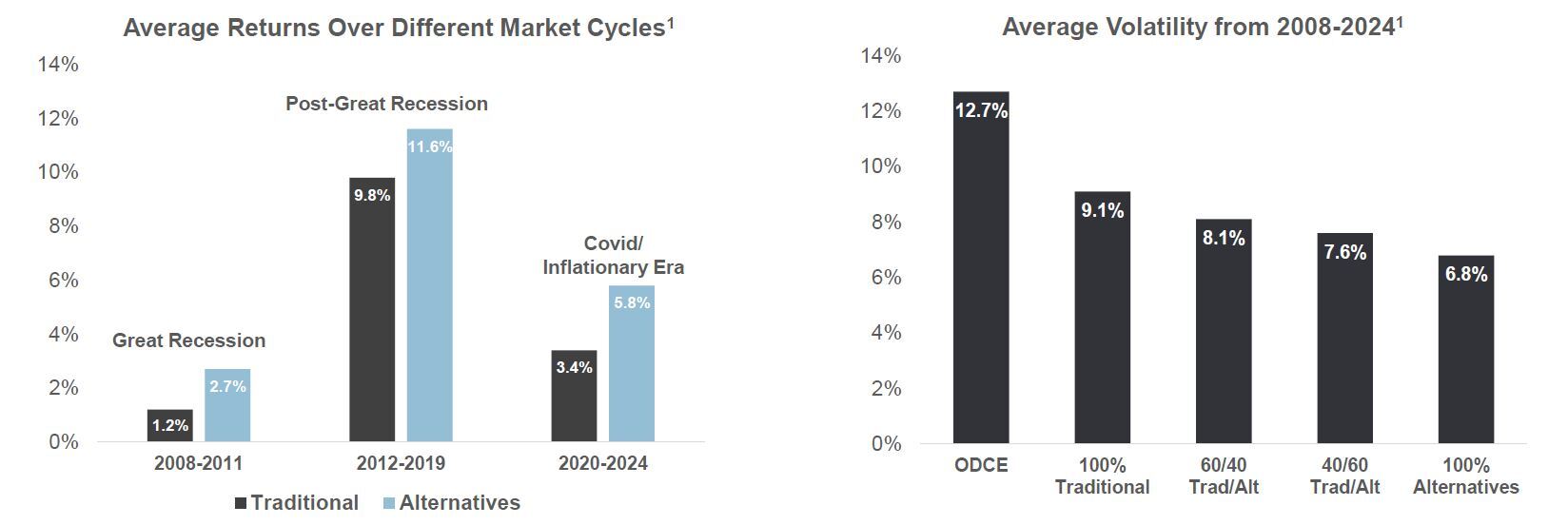 Past performance is not a guarantee of future results. Chart for illustrative purposes only. Data source is NCREIF – Expanded NPI and ODCE – Q4 2024. An investment cannot be made directly in an index. Direct real estate is represented by the NCREIF Property Index (NPI). The NPI is a leading benchmark of institutionally owned, private real estate programs. The NPI is based on the unleveraged returns from a large pool of individual, investment grade commercial real estate properties across retail, office, industrial, and apartment sectors. The market values of the properties in the NPI are determined by appraisals rather than by market-based prices of the programs. While the NPI is not a measure of non-listed REIT performance, ALT REIT management generally believes that the NPI is an appropriate and accepted index for the purpose of evaluating real estate returns and risks against other types of investments. The NPI is not a measure of non-listed REIT performance, since non-listed REITs use leverage; require the payment of up-front and other fees that typically exceed those of institutional programs; subject to expenses related to being a public company and fees and expenses associated with raising capital. These fees and expenses lower non-listed REIT returns. The NPI does not reflect management fees and other investment entity fees, costs and expenses that are typical of non-listed REITs. In addition, non-listed REITs are illiquid and their investment goals and objectives, as well as their strategies, may differ from the entities represented in the NPI. Non-listed REIT also differ from the NPI since a portion of the REIT’s holdings may consist of loans and other real estate-related investments, while the NPI is a measure of performance of equity investments in institutional properties that consist of office, industrial and retail. Asset allocation/diversification does not guarantee a profit or protect against a loss in a declining market. Past performance is no guarantee of future results. There can be no assurance that we will be able to identify or acquire investments in any particular asset classes or in any particular concentration or ratio or that we will meet our investment objectives.